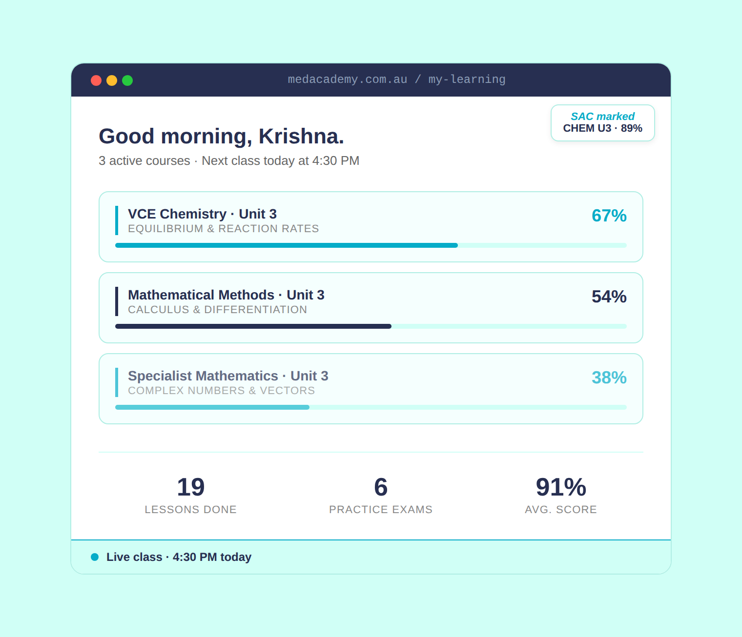 MedAcademy is a Melbourne tutoring academy for students who want more than generic worksheets and recycled practice tests. Every workbook, every practice exam, every video is written, refined, and pressure-tested by our tutors.